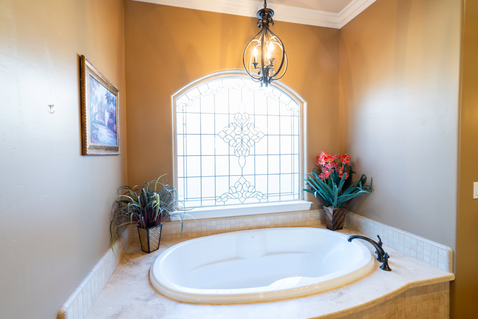 Custom leaded glass window over tub
