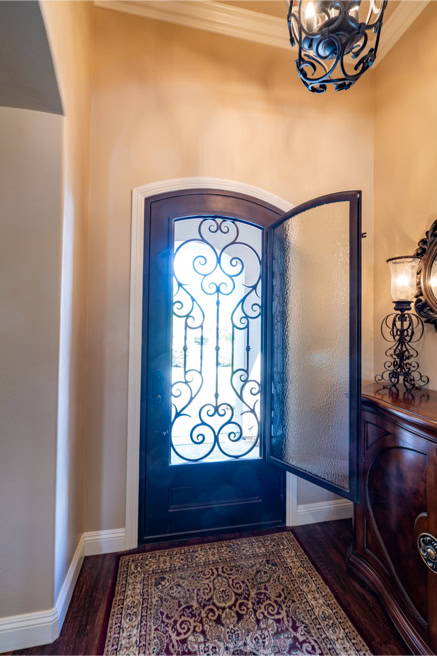 Designer wrought iron front door with opening glass panel
